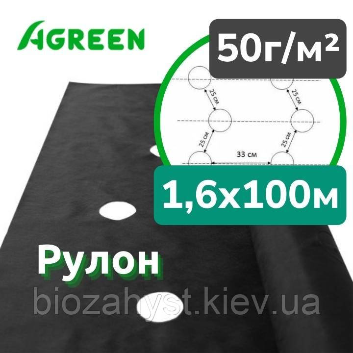 50г/кв.м Агроволокно Чорне 1,6х100м Agreen, перфорація 3 отв., Рулон | Агроволокно для Мульчування, НЕ проводить світло